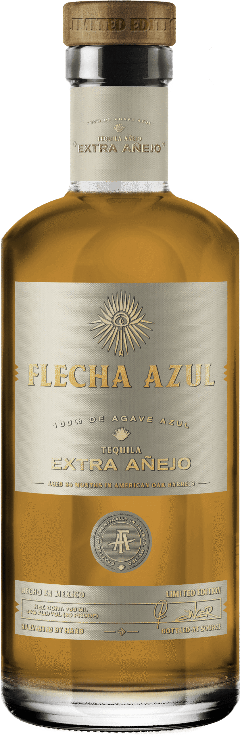 Flecha Azul Extra Anejo Tequila floods the senses with praline, roasted pineapple, and vanilla. On the palate its weight is tempered with gently-extracted wood tannins for a balanced and complex finish.